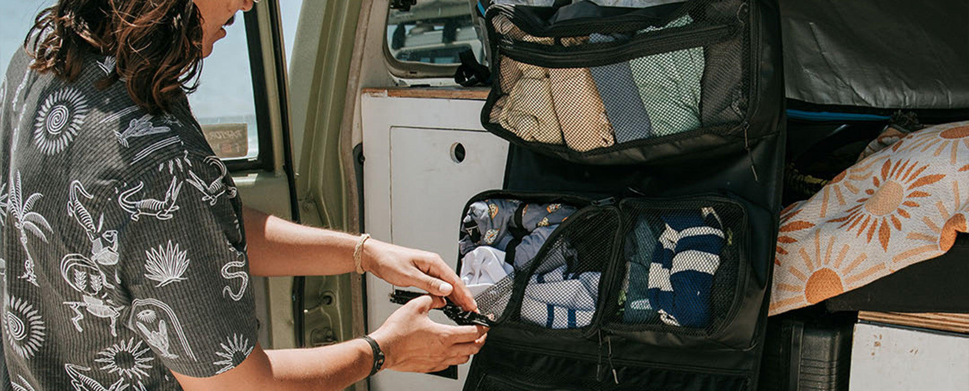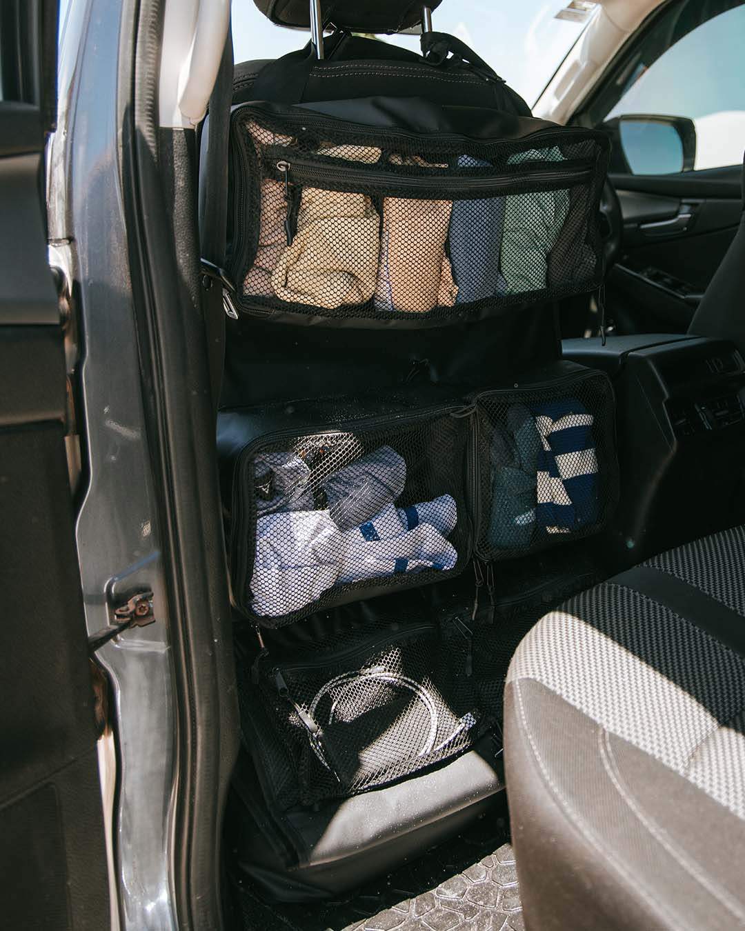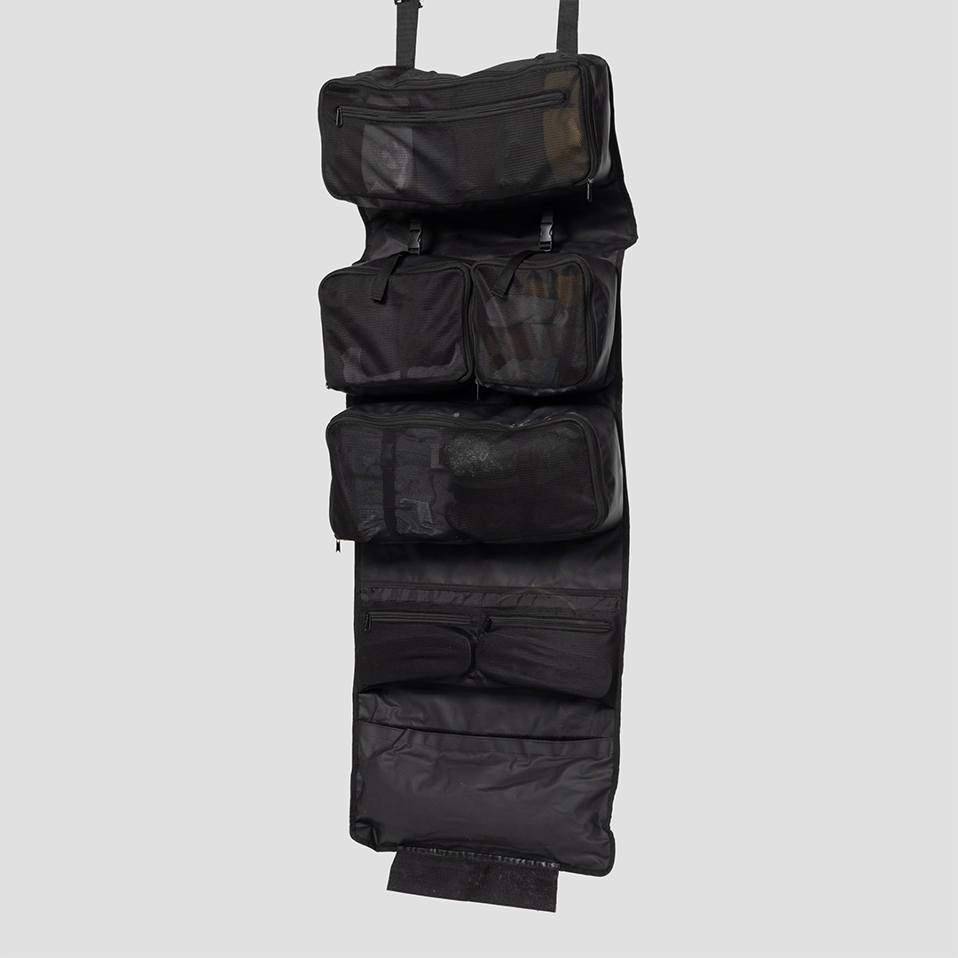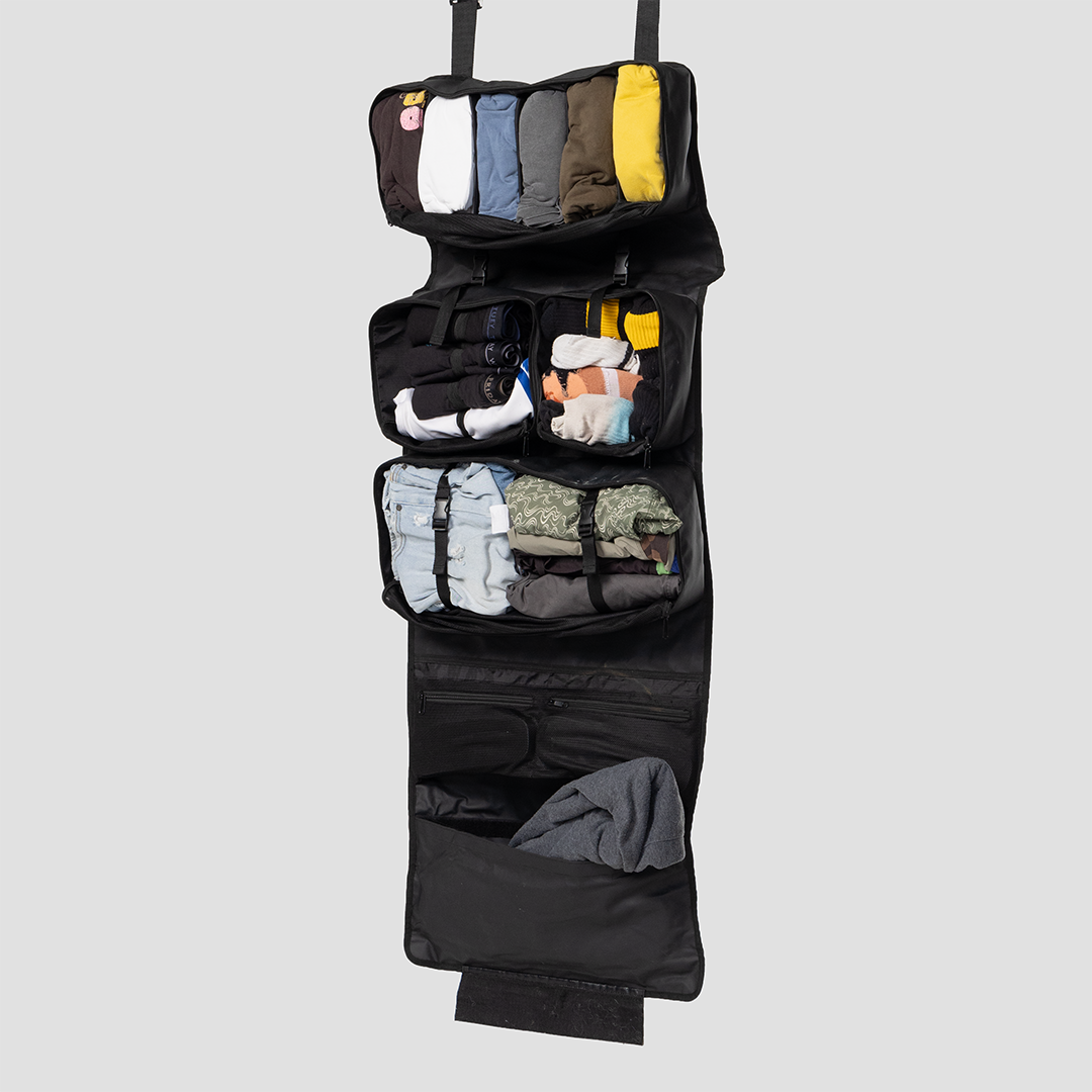 We’ve SOLVED gear organization for adventurers. The PackedGear Roll Up Closet unrolls from a carry-on-sized duffel into a full hanging closet. With metal G-hooks and an included headrest adapter, you can hang it off your seat, under an awning... Hang it anywhere. Built-in dividers keep everything in place, so you’re not digging through a black hole for clean socks. Made from durable, waterproof PVC and reinforced with heavy-duty nylon webbing, so stuffing your closet as full as you can is no problem.